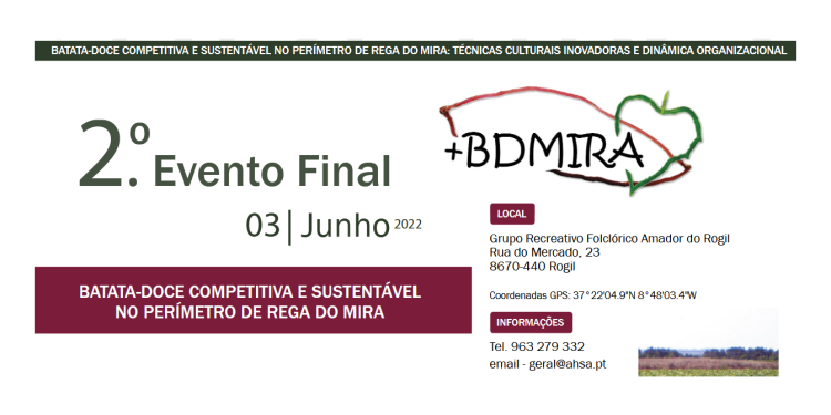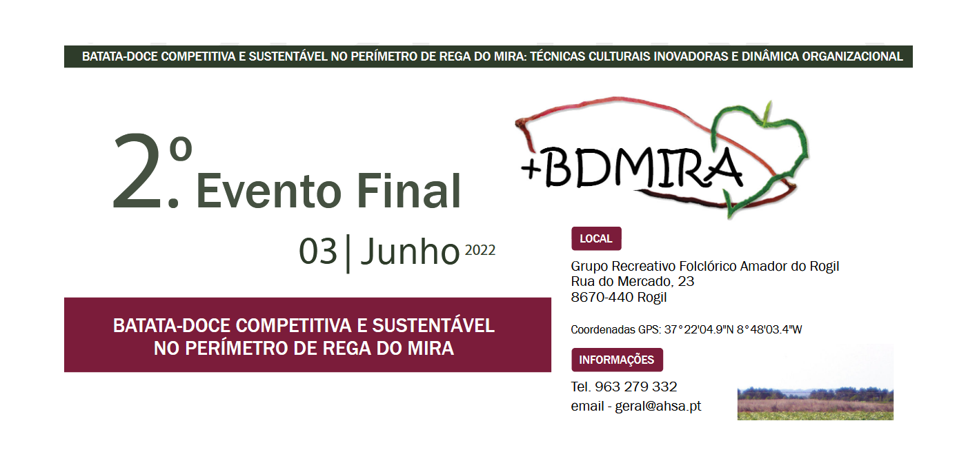 Sob o tema ‘Batata-doce competitiva e sustentável no Perímetro de Rega do Mira’, vai decorrer o 2.º Evento Final do Grupo Operacional ‘+BDMIRA – Batata-doce competitiva e sustentável no Perímetro de Rega do Mira: técnicas culturais inovadoras e dinâmica organizacional’, no Rogil (Coordenadas GPS: 37⁰ 22’04,9″ N; 8⁰ 48′ 03,4″ W), no próximo dia 3 de junho, conforme programa em anexo.