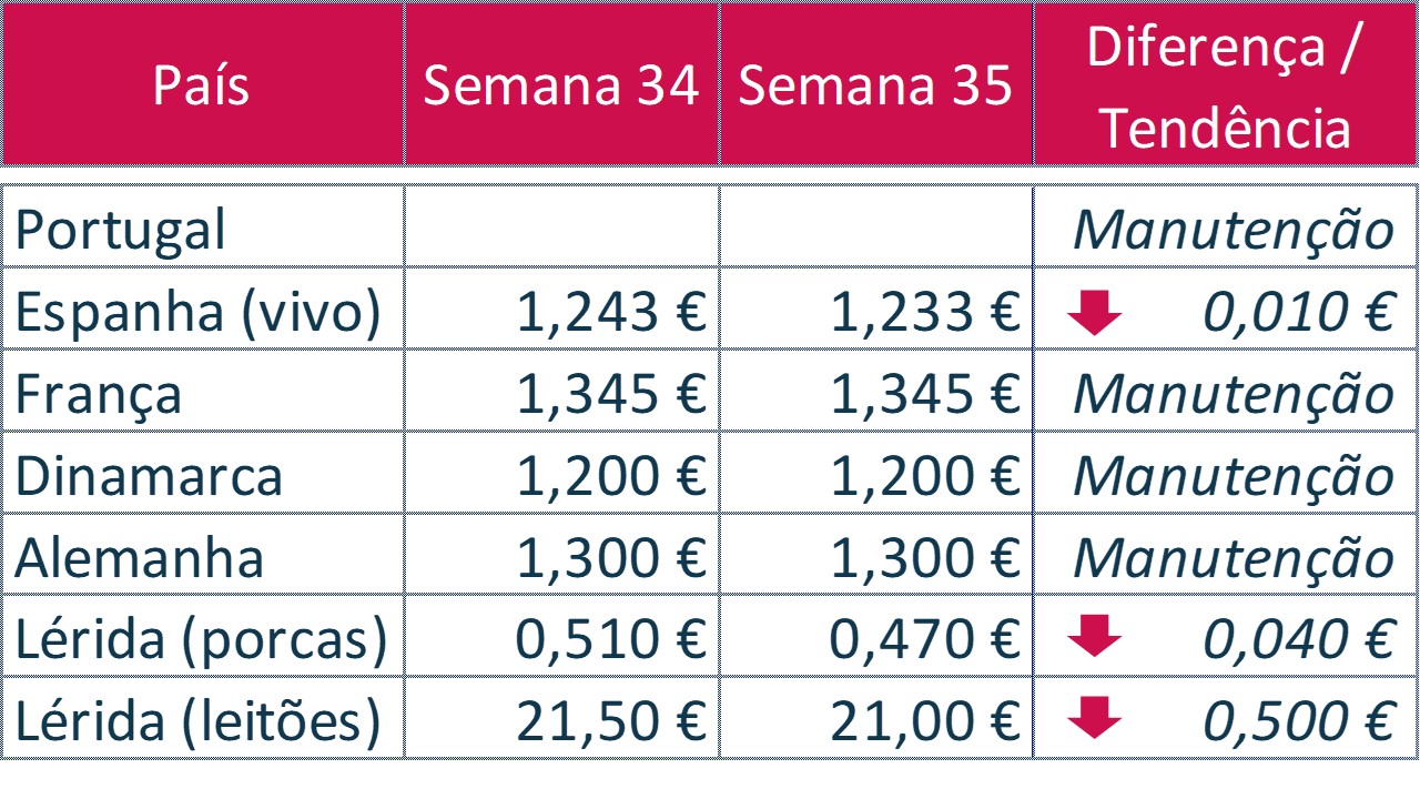 Analisando estes valores, segundo equivalências teóricas, teremos em euros/kg peso vivo para a semana 35/2021 (30/08 a 03/09): Espanha 1,23; França 1,20; Alemanha 1,01; Holanda 0,98; Bélgica 1,06; Dinamarca 1,08.