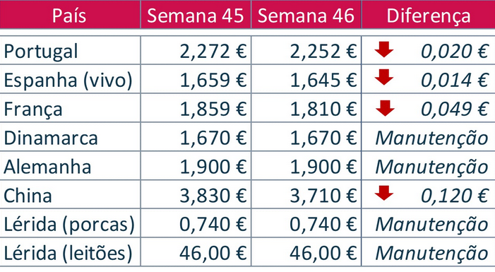 A China está a acelerar e, apesar da descida desta semana, Espanha volta a ter o preço mais alto da Europa, na comparação do valor em vivo. Também pela aceleração do mercado chinês desde outubro, Dinamarca e Países Baixos conseguem resistir, forçando os matadouros alemães a manter esta semana, não significando que baixem a pressão para baixar o preço nas próximas semanas, numa altura em que o consumo interno alemão está em mínimos históricos.