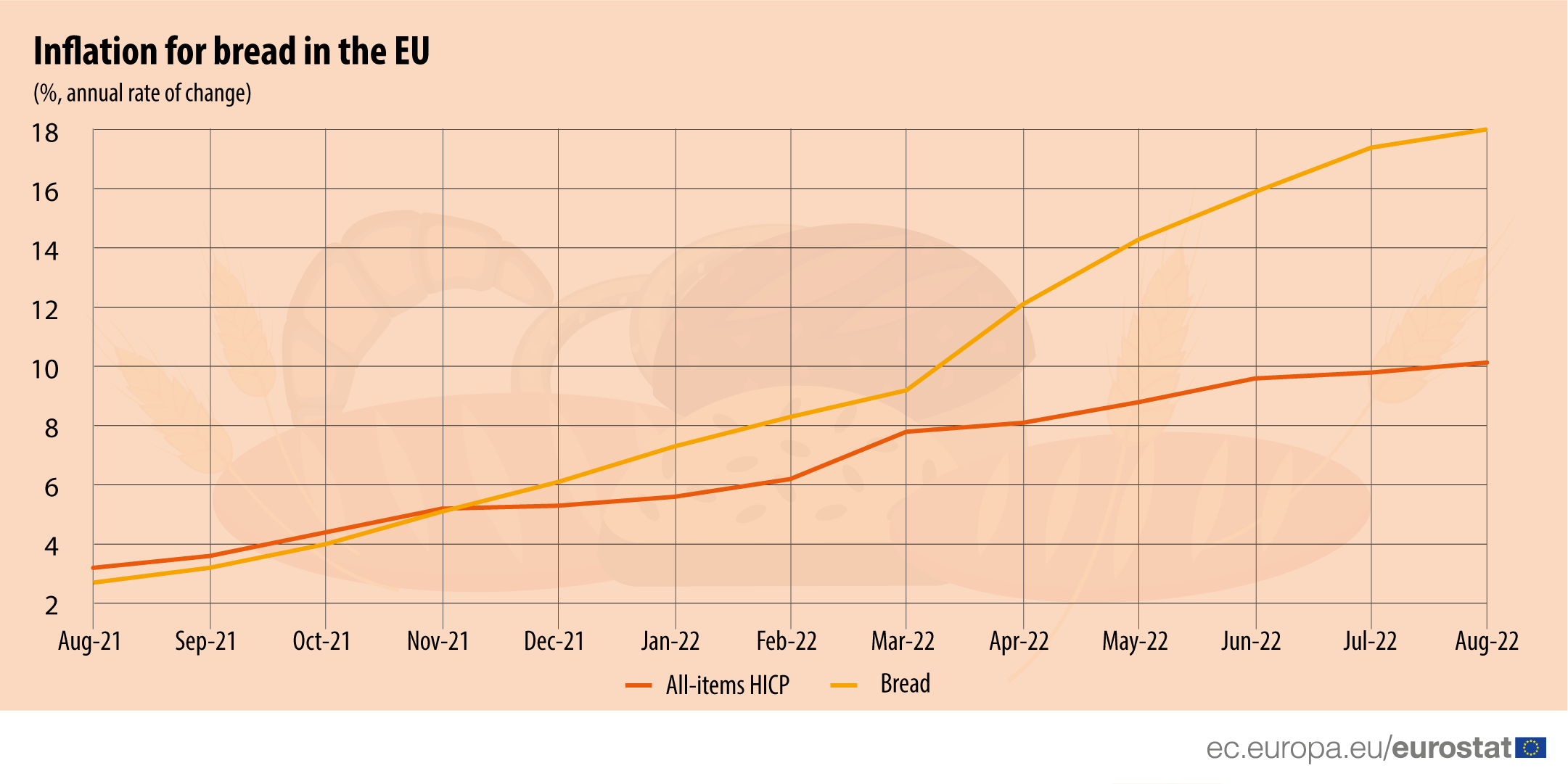 In August 2022, the price of bread in the EU was on average 18% higher than in August 2021. This is a huge increase compared with August 2021, when the price of bread was on average 3% higher than in August 2020. Monthly data also show a significant increase in headline inflation, although not as large (from +3% to +10%).