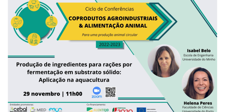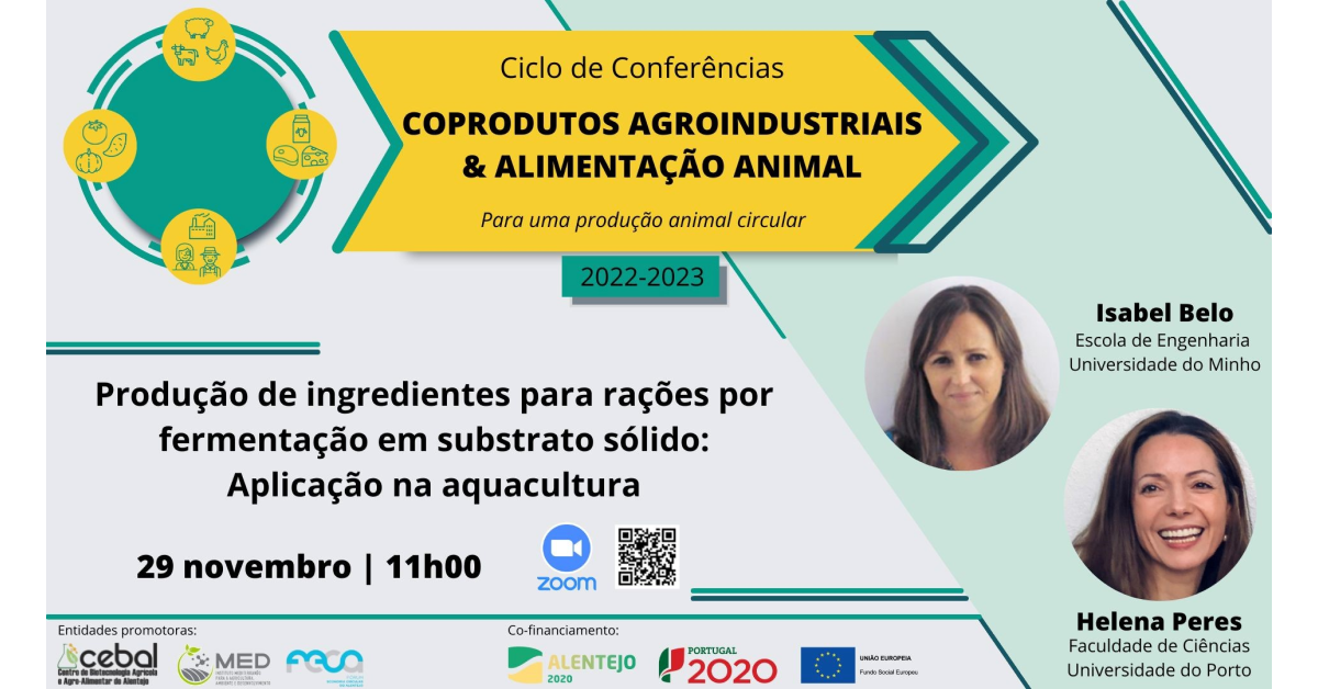 A próxima sessão do Ciclo de conferências “Coprodutos Agroindustriais & Alimentação Animal”, que terá lugar no dia 29 de novembro, pelas 11h00, tem como convidadas a Doutora Isabel Belo, Professora Auxiliar no Departamento de Engenharia Biológica da Escola de Engenharia da Universidade do Minho, e a Doutora Helena Peres, Professora Auxiliar no Departamento de Biologia DA Faculdade de Ciências do Porto, que irão apresentar a palestra intitulada: “Produção de ingredientes para rações por fermentação em substrato sólido: aplicação na aquacultura”.