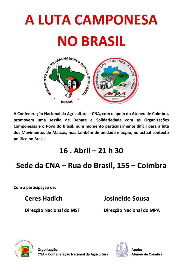 Na próxima segunda-feira, dia 16 de Abril, na Sede da CNA, em Coimbra, Sessão Debate e Solidariedade com as Organizações Camponesas e o Povo do Brasil, com a participação de Dirigentes do MST – Movimento dos Trabalhadores Rurais Sem Terra e do MPA – Movimento dos Pequenos Agricultores!