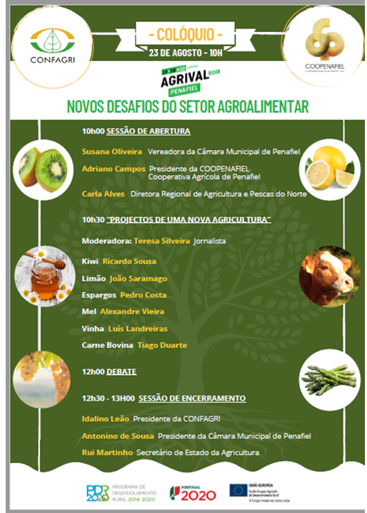 A CONFAGRI volta a marcar presença em mais uma edição da AGRIVAL – Feira Agrícola do Vale de Sousa, em colaboração com a Câmara Municipal de Penafiel e com a Cooperativa Agrícola local, a COOPENAFIEL, este ano com um Colóquio subordinado ao tema “Novos Desafios do Setor Agroalimentar”, agendado para o dia 23 de Agosto, às 10 horas.