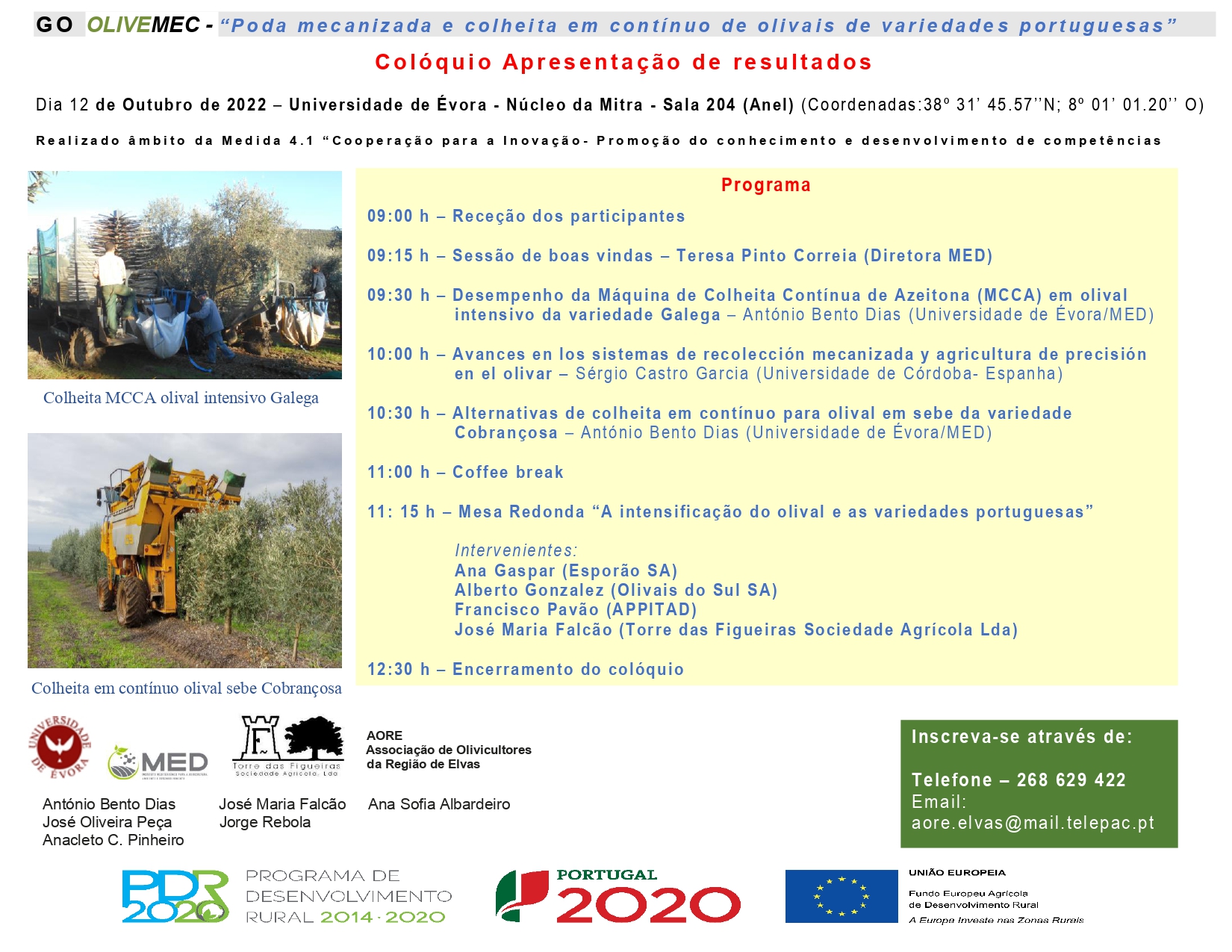 Decorre na manhã de 12 de Outubro, a partir das 9h00, na Universidade de Évora – Núcleo da Mitra / Sala 204 (Anel) –, um colóquio de apresentação de resultados do grupo operacional Olivemec. Esta iniciativa é organizada pelo grupo operacional Olivemec – que é dedicado ao tema “Poda mecanizada e colheita em contínuo de olivais de variedades portuguesas” –, com o apoio do Instituto Mediterrâneo para a Agricultura, Ambiente e Desenvolvimento (MED), da Universidade de Évora.