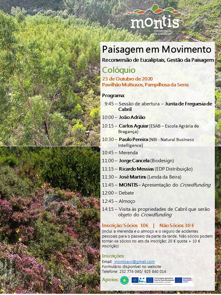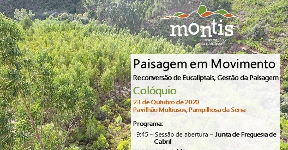 No próximo dia 23 de outubro, a MONTIS vai realizar um colóquio sobre reconversão de eucaliptais e gestão da paisagem, no âmbito da campanha de crowdfunding que vamos realizar com o tema Do eucaliptal até à mata (https://ppl.pt/montis). Nesse âmbito, o tema escolhido para o colóquio é Paisagem em Movimento e tem como objetivo divulgar a importância da gestão da paisagem, envolvendo as pessoas, em prol da biodiversidade.