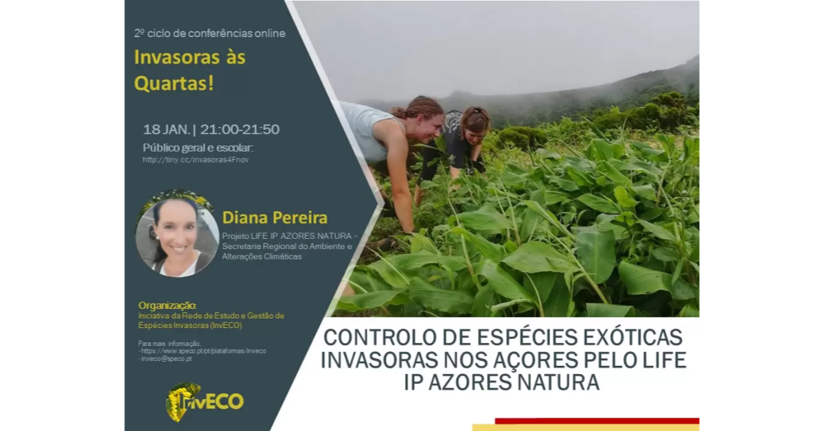 No próximo dia 18 de janeiro, às 21h, terá lugar a 3ª sessão do 2º Ciclo de Conferências online “Invasoras às quartas!”, que será dedicada aos Açores. A palestra intitulada “Controlo de espécies exóticas invasoras nos Açores pelo LIFE IP AZORES NATURA“, será conduzida por Diana Pereira. A palestra terá a duração de aproximadamente 30 min e terminará com cerca de 20 min para questões/ debate de ideias.