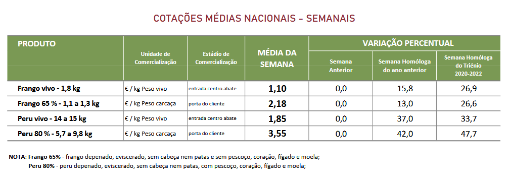 Na semana em análise as cotações médias nacionais do frango vivo (de 1,8 kg), do frango abatido (65% – de 1100 a 1300 g), do peru vivo (de 14 a 15 kg) e do peru abatido (80% – de 5,7 a 9,8 kg) mantiveram-se estáveis em relação à semana anterior. Na Beira Litoral a oferta foi média e a procura relativamente animada. Verifica-se alguma falta de frango grande, tendo-se registado uma ligeira subida das cotações mín. e máx. do frango abatido de >1300 g (+5 cêntimos / kg).