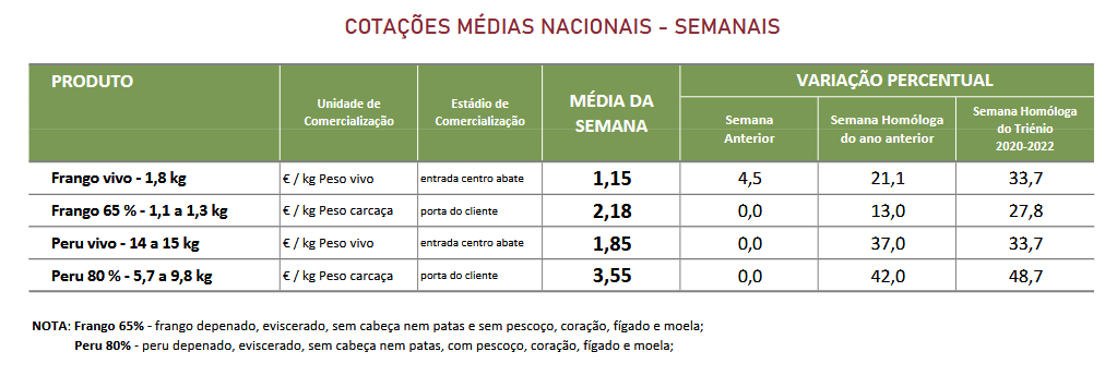 Na semana em análise registou-se um acréscimo da cotação média nacional do frango vivo (de 1,8 kg) em relação à semana anterior (+5 cêntimos / kg); estabilidade do frango abatido (65% – de 1100 a 1300 g), do peru vivo (de 14 a 15 kg) e do peru abatido (80% – de 5,7 a 9,8 kg). No Ribatejo e Oeste subiram o frango vivo e o frango abatido de 600-700, 700-900, 900-1100 e >1300 g (+10 cêntimos / kg). Na Beira Litoral voltou a aumentar o frango abatido de >1300 g (+5 cêntimos / kg) e deu-se uma redução do peito e da perna de peru e do frango do campo (-10 cêntimos / kg nos três casos).