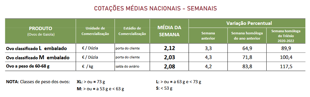 Após um longo período de estabilidade, registou-se na semana em análise um aumento das cotações médias nacionais dos ovos de gaiola, quer na produção (ovo a peso de 60 a 68 g), quer classificados e embalados (ovotermo) das classes de peso M e L, respetivamente +8 cêntimos / kg, +8 cêntimos / dúzia e +7 cêntimos / dúzia. Os acréscimos de cotações dos ovos de gaiola variaram entre 5 e 20 cêntimos nas duas regiões, Ribatejo e Oeste e Beira Litoral. Subida generalizada dos ovos de solo e de ar livre, +10 cêntimos / dúzia.