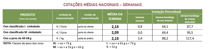 Na semana em análise registou–se um ligeiro acréscimo das cotações médias nacionais dos ovos, na produção (ovo a peso de 60 a 68 g) e classificados e embalados (ovotermo) da classe de peso L, em relação à semana anterior, respetivamente +5 cêntimos / kg e +1 cêntimo / dúzia. Estabilidade dos ovos de gaiola classificados e embalados da classe de peso M.