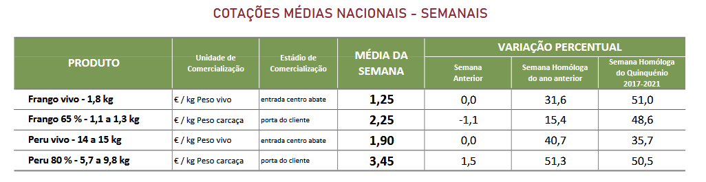 Na semana em análise registou–se uma descida da cotação média nacional do frango abatido (65% – de 1100 a 1300 g) e uma subida de cotação média nacional do peru abatido (80% – de 5,7 a 9,8 kg) em relação à semana anterior, respetivamente –3 cêntimos / kg e +5 cêntimos / kg. Estabilidade do frango vivo (de 1,8 kg) e do peru vivo (de 14 a 15 kg). Decréscimo do peito (–10 cêntimos / kg) e perna de frango (–2 cêntimos / kg) e acréscimo da perna.