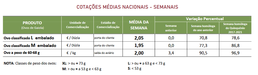 Na semana em análise registou–se novamente um acréscimo da cotação média nacional dos ovos de gaiola na produção (ovo a peso de 60 a 68 g) em relação à semana anterior (+7 cêntimos / kg). Estabilidade das cotações dos ovos classificados e embalados (ovotermo) das classes de peso M e L, pela 5ª semana consecutiva.