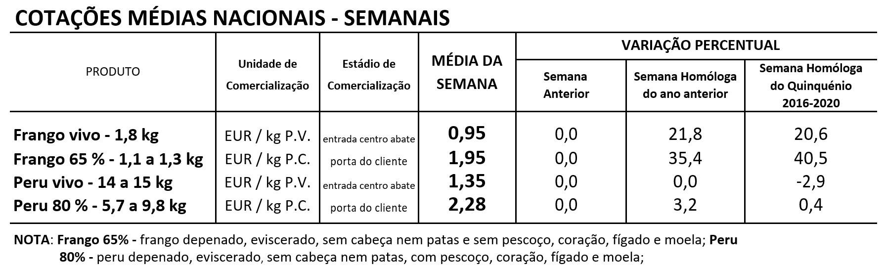 Na semana em análise as cotações médias nacionais do frango vivo (de 1,8 kg) e abatido (65% – de 1100 a 1300 g) e do peru vivo (de 14 a 15 kg) e abatido (80% – de 5,7 a 9,8 kg), mantiveram-se estáveis em relação à semana anterior.