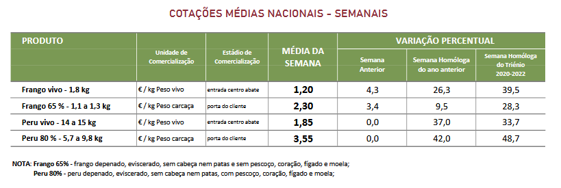 Na semana em análise registou-se um acréscimo das cotações médias nacionais do frango vivo (de 1,8 kg) e do frango abatido (65% – de 1100 a 1300 g) em relação à semana anterior, respetivamente +5 e +7cêntimos / kg. Estabilidade do peru vivo (de 14 a 15 kg) e do peru abatido (80% – de 5,7 a 9,8 kg). Subida do frango abatido nas duas regiões, Beira Litoral e Ribatejo e Oeste (+5 a +10 cêntimos / kg). No Ribatejo e Oeste subiu ainda o frango vivo (+5 cêntimos / kg) e desceram as galinhas vivas pesadas (-5 cêntimos / kg). Na Beira Litoral aumentou a perna de frango (+5 cêntimos / kg) e diminuiu a perna de peru (-10 cêntimos / kg).
