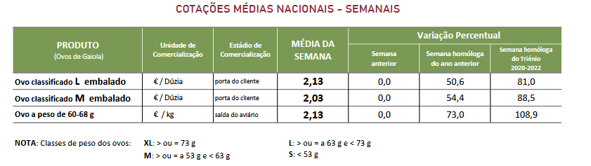 Na semana em análise as cotações médias nacionais dos ovos de gaiola, quer na produção (ovo a peso de 60 a 68 g), quer classificados e embalados (ovotermo) das classes de peso M e L, mantiveram-se estáveis em relação à semana anterior. Isto após um longo período de estabilidade ter sido