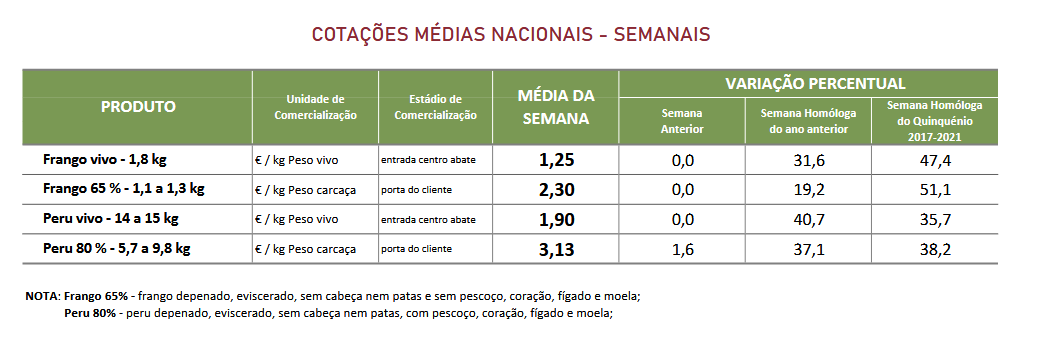 Na semana em análise registou-se um ligeiro acréscimo da cotação média nacional do peru abatido (80% – de 5,7 a 9,8 kg) em relação à semana anterior (+5 cêntimos / kg). Estabilidade das cotações médias nacionais do frango vivo (de 1,8 kg), do frango abatido (65% – de 1100 a 1300 g) e do peru vivo (de 14 a 15 kg).