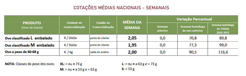 Na semana em análise as cotações médias nacionais dos ovos de gaiola na produção (ovo a peso de 60 a 68 g) e classificados e embalados (ovotermo) das classes de peso M e L mantiveram-se de novo estáveis em relação à semana anterior. As cotações dos ovos classificados e embalados (ovotermo) das classes de peso M e L não apresentaram quaisquer alterações, pela 10ª semana consecutiva.