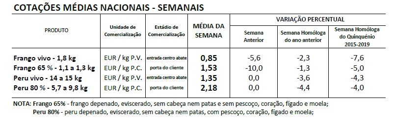 Na semana em análise, as cotações médias nacionais do frango, vivo (de 1,8 kg) e abatido (65% – de 1100 a 1300 g) sofreram uma redução em relação à semana anterior, respectivamente -5 cêntimos / kg e -17 cêntimos / kg. Estabilidade do peru, vivo (de 14 a 15 kg) e abatido (80% – de 5,7 a 9,8 kg).