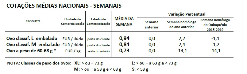Na semana em análise as cotações médias nacionais dos ovos, quer do ovo na produção (ovo a peso de 60 a 68 g), quer dos ovos classificados e embalados em ovotermo das classes de peso M e L, mantiveram-se estáveis em relação à semana anterior.