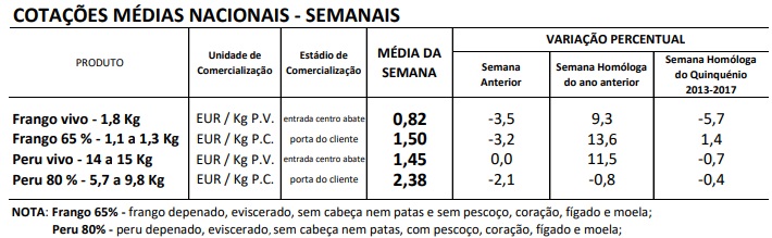 As cotações médias nacionais do frango, vivo (de 1,8 Kg), -3 cêntimos / Kg e abatido (65% – de 1100 a 1300 g), -5 cêntimos / Kg e do peru abatido (80% – de 5,7 a 9,8 Kg), -5 cêntimos / Kg, sofreram uma redução em relação à semana anterior; estabilidade do peru vivo (14 a 15 Kg).