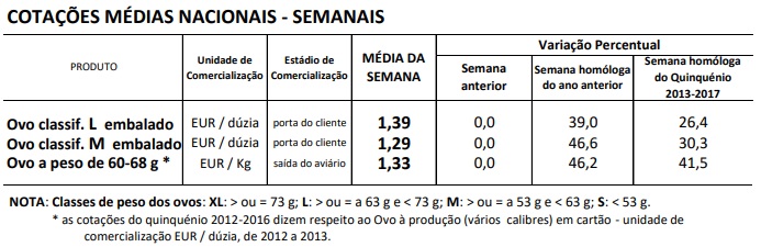 Na semana em análise as cotações médias nacionais dos ovos, quer na produção (ovo a peso de 60-68 g), quer classificados e embalados em ovotermo das classes de peso M e L, continuaram a manter-se estáveis em relação à semana anterior.