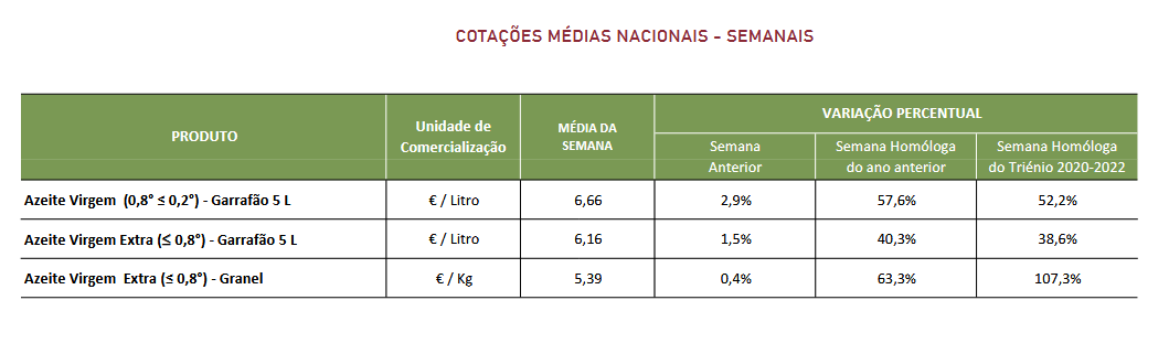 Prosseguiu a campanha de comercialização de Azeite 2022/ 23 nas áreas de mercado Alentejo Sul, Alentejo Central, Alentejo Norte, Ribatejo, Beira Litoral, Beira Interior e Trás-os-Montes. O produto classifica-se como bom em relação à qualidade, excepto nos mercados da Beira Litoral e da Beira Interior que apresentam qualidade média devido a problemas fitossanitários (mosca e gafa). Nas áreas de mercado do Alentejo registaram-se cotações superiores às verificadas na campanha anterior. As previsões do INE determinam uma quebra de produção considerável, como consequência da conjugação de um ano de contrassafra com fatores meteorológicos adversos, nomeadamente a seca extrema e as altas temperaturas, agravada pelos ataques da mosca da azeitona e de gafa, consequência da ausência de tratamentos.