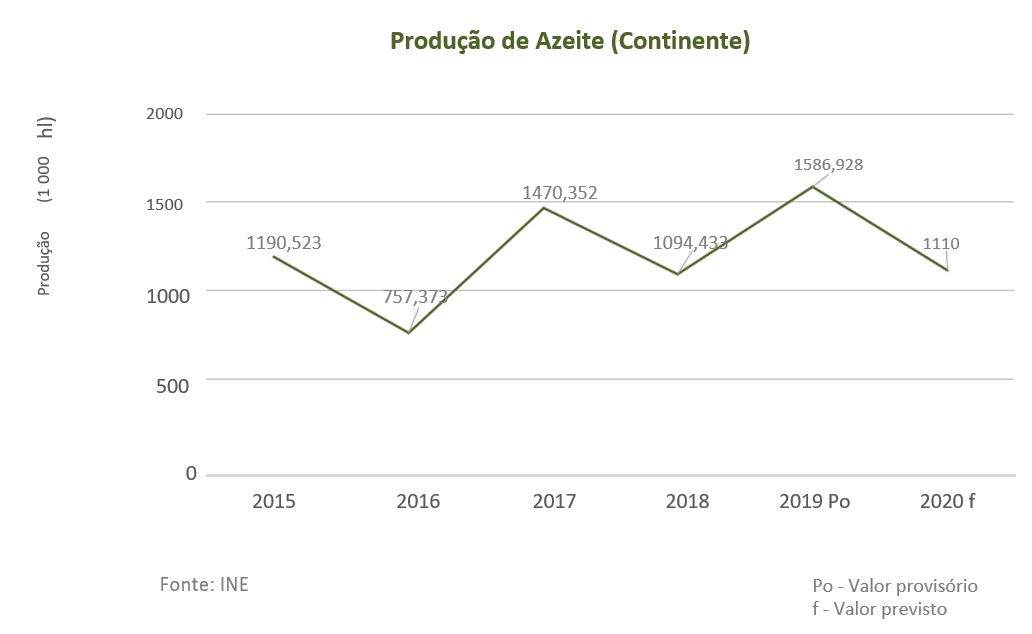 O INE estima uma diminuição significativa no volume de produção de azeite, cerca de menos 30%, em relação à campanha anterior. Apesar disso, prevê-se que seja superior a 1 milhão de hectolitros, como se tem verificado desde 2017. Em relação ao mês de julho, o INE observou uma variação positiva no índice de preços no produtor de azeite a granel (+26,2%) e em relação ao mês anterior, verificou um aumento no índice de preços do azeite a granel em +4,2%.