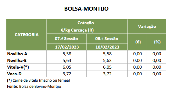 Na área de mercado Viseu, as cotações, mínima e máxima, de novilha, 12 a 24 meses, cruzada Charolês, aumentaram, 0,15 €/kg C e 0,10 €/kg C, respetivamente, as cotações, mínima e máxima, de novilho, 12 a 24 meses, cruzado Charolês, aumentaram, 0,05 €/kg C e 0,10 €/kg C, respetivamente
