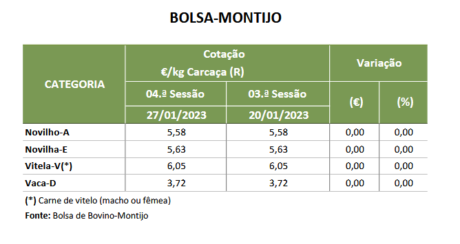 Na Região: as cotações mínimas, de novilha e de novilho, 12 a 24 meses, cruzados Charolês, aumentaram, 0,30 €/kg C; a cotação mais frequente, de vitelo macho, 6 a 8 meses, cruzado Charolês, aumentou, 0,44 €/kg V, mas a cotação máxima, diminuiu, 0,05 €/kg V; as cotações, máxima e mais frequente, de vitelo macho, 8 a 12 meses, cruzado Charolês, diminuíram, 33,00 €/U e 82,00 €/U, respetivamente, mas, a cotação, mínima, aumentou, 115,00 €/U.