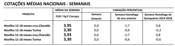 As cotações médias nacionais dos novilhos e novilhas de 12-18 meses, de raça Turina e cruzado de Charolês, mantiveram-se estáveis em relação à semana anterior.