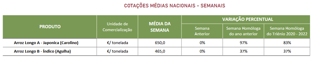 Prosseguiu a campanha de comercialização 2022/ 23 de arroz na área de mercado Vale do Sado e Mira onde apresenta uma oferta média para uma procura média a alta. Em relação à qualidade, o grão classifica-se como bom. A realçar o elevado valor da cotação do arroz carolino, comparando com a campanha anterior (+97%) e a média dos últimos três anos (+83%), devido à elevada procura mundial por este commodity . A nível nacional, o INE prevê quebras de produção na ordem dos 15% em comparação com a campanha anterior. Estima-se que 87% do arroz semeado em Portugal em 2022 foi do tipo Longo A / subespécie Japónica e 11% do tipo Longo B / subespécie Índica.