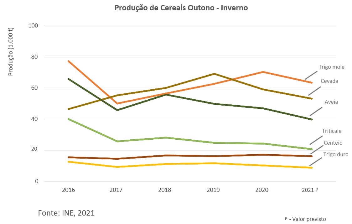 Nos cereais de outono-inverno, a acentuada redução dos teores de humidade do solo na fase de enchimento do grão não permitiu alcançar as produtividades inicialmente previstas pelo INE, principalmente nas searas instaladas mais cedo e, em particular, no Alentejo Central e Baixo Alentejo.