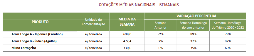 Na semana em análise registaram-se cotações de Arroz nas áreas de comercialização Vale do Mondego, Vale do Tejo e Sorraia e Vale do Sado e Mira. Em relação à qualidade, o grão classifica-se como bom em todas as áreas de mercado. A realçar o elevado valor da cotação do arroz carolino, comparando com a campanha anterior (+89%) e a média dos últimos três anos (+78%), devido à elevada procura mundial por este commodity. A nível nacional, o INE prevê quebras de produção na ordem dos 15% em comparação com a campanha anterior. Estima-se que 87% do arroz semeado em Portugal em 2022 foi do tipo Longo A / subespécie Japónica e 11% do tipo Longo B / subespécie Índica. Processeguiu a campanha de comercialização de milho na área de mercado do Alentejo e na da Beira Litoral. O produto apresenta uma boa qualidade em ambas as áreas de comercialização. No Alentejo estima-se que a produtividade seja favorável embora ligeiramente inferior, entre 5% a 10%, em relação à campanha anterior.