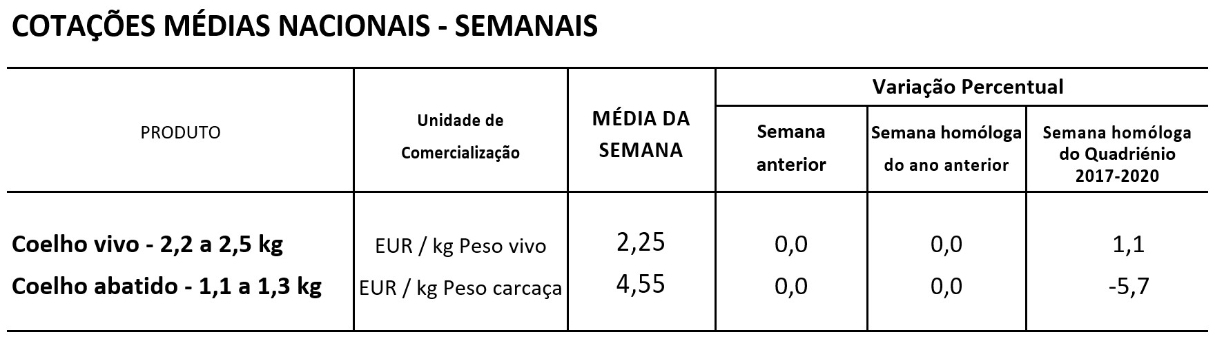 Na semana em análise as cotações médias nacionais do coelho, vivo (de 2,2 a 2,5 kg) e abatido (de 1,1 a 1,3 kg), voltaram a manter-se estáveis em relação à semana anterior.
