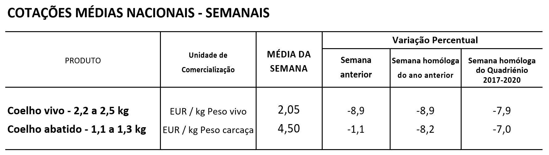 Na semana em análise as cotações médias nacionais do coelho, vivo (de 2,2 a 2,5 kg) e abatido (de 1,1 a 1,3 kg), sofreram uma redução em relação à semana anterior, respetivamente -20 cêntimos / kg e -5 cêntimos / kg.