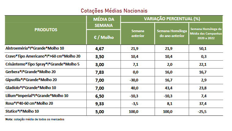 Na região Oeste, área de mercado Península de Setúbal, verificou-se uma descida da cotação da statice em 25% e da mattiola 13%, devido a uma menor produção e consequente menor oferta.