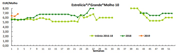 Na Região Centro, na área de mercado Beira Litoral, a oferta continuou escassa e a procura normal. Subida da cotação máxima e da mais frequente.