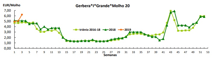 Na Região Centro, na área de mercado Beira Litoral, a oferta foi fraca e a procura média. Subida das cotações da gerbera, categoria I e II.