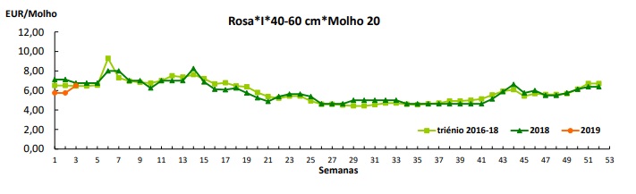 Rosa – Na Região Norte, na área de mercado Entre Douro e Minho, as cotações mantiveram-se estáveis. A oferta foi suficiente para a procura. Concorrência de produto importado do Equador e Holanda.
