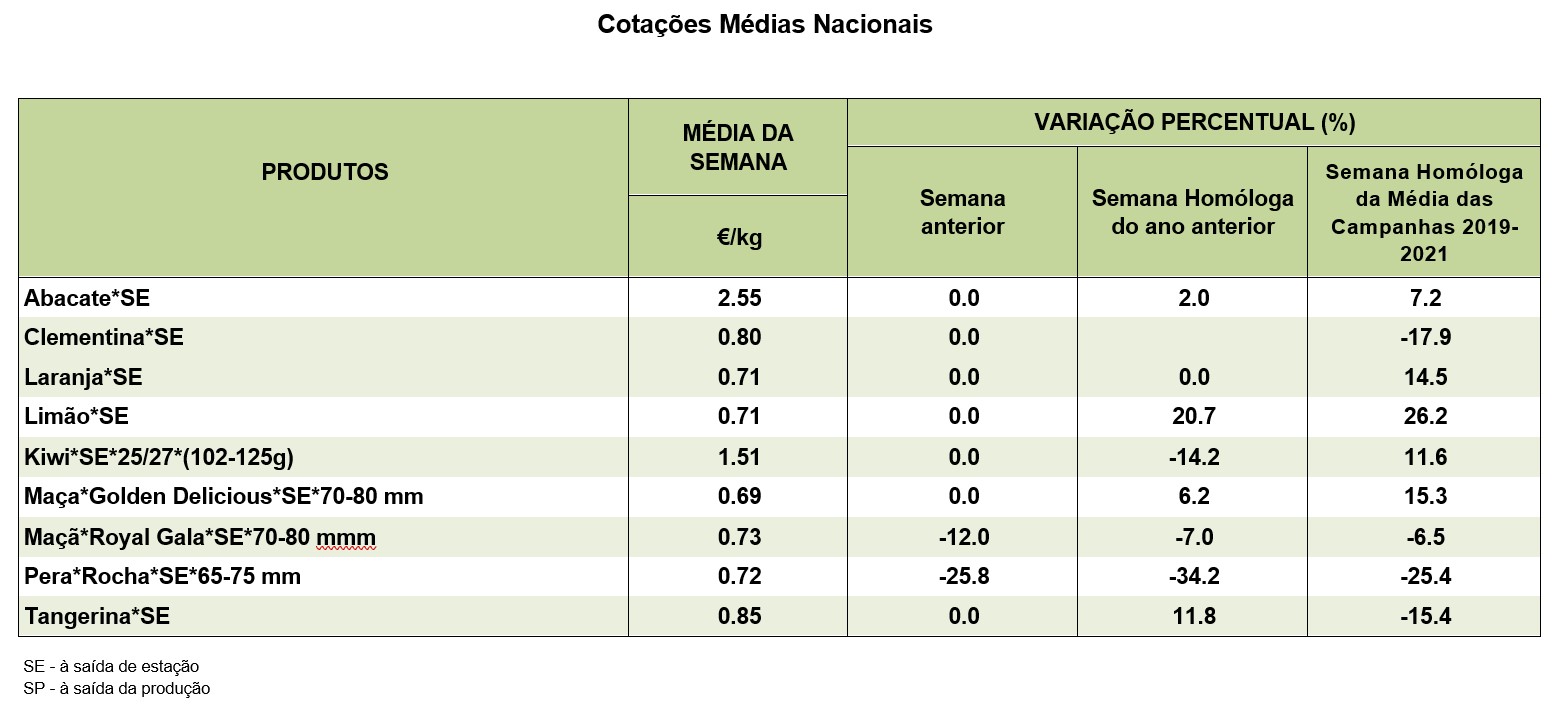 Exportação de maçã de qualidade para alguns países da Europa, Africa, Médio Oriente e América do Sul, principalmente das variedades “Golden” e “Royal Gala”. Algumas cotações mais baixas refletem a maçã atingida pelo granizo que os produtores, à semelhança da semana passada, tentam colocar nos mercados menos exigentes. A grande distribuição tem valorizado a maçã “Royal Gala” do Oeste em detrimento da produzida na região Norte. Esta campanha teve produções superiores em todas as variedades, aumentos na ordem dos 40% a 50%.
