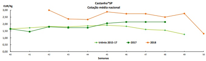 Castanha – Na Região Norte, na área de mercado, Bragança, o volume de transacções da castanha “Longal” foi pouco significativo, devido à oferta quase nula. Cotações estáveis. Fim de campanha.