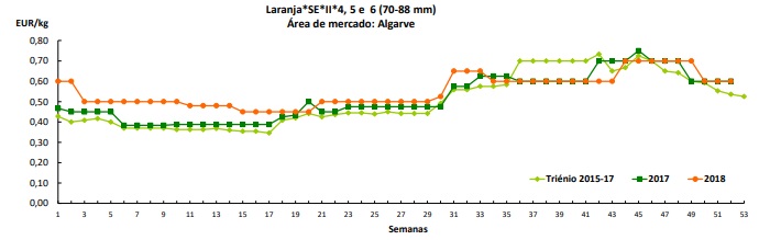 No Algarve, a oferta de laranja “Newhall” foi superior à procura média. Escoamento regular. Cotações estáveis.
