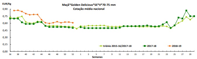 Maçã – Oferta abundante, das variedades, Golden Delicious, Granny Smith, Red Delicious, Royal Gala e Reineta Parda, de boa qualidade, com a procura a não escoar todo o produto e manutenção das cotações.