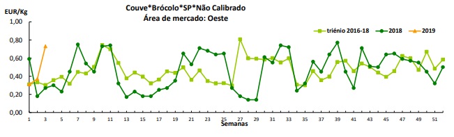 Couve “Brócolos” – No Algarve, a oferta foi suficiente para a procura média. Escoamento regular. Cotações estáveis.