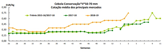 Cebola de Conservação – Na Região Norte, na área de mercado Entre Douro e Minho, as cotações valorizaram, novamente, devido ao decréscimo da oferta. Procura média. Boa qualidade do produto e escoamento sem dificuldade . Concorrência de produto espanhol.