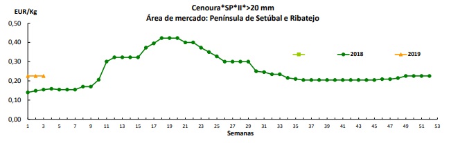 Cenoura – Oferta suficiente de cenoura nacional, proveniente essencialmente da região do Ribatejo e Oeste (Montijo). Oferta considerável de produto espanhol e francês. Bom escoamento. Manutenção das cotações.