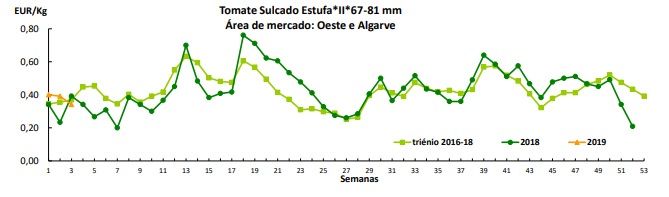 Tomate – No Algarve, a oferta de tomate “Cacho, Sulcado e Alongado” foi superior à procura ligeiramente baixa. Subida da cotação máxima do tomate “sulcado”> 81 mm. Boa qualidade do produto. Escoamento “aos poucos”.