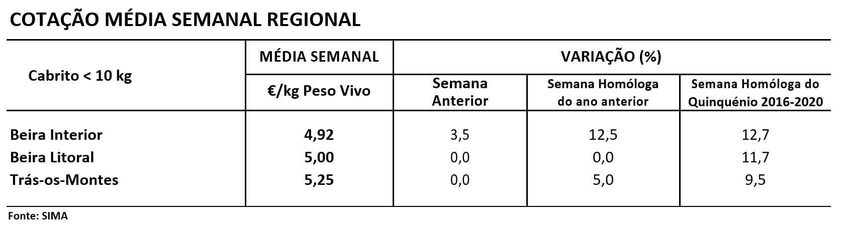 Nesta região cotação média, de cabrito, < 10 kg, aumentou, 0,17 €/kg Peso Vivo. As restantes cotações não tiveram alterações,