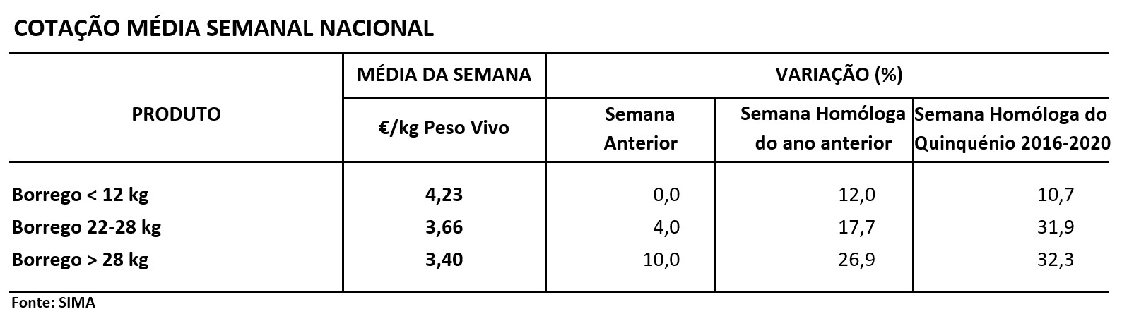A cotação média de borrego, 22 a 28 kg, aumentou 0,14 €/kg Peso Vivo, e a cotação média de borrego, > 28 kg, aumentou 0,31 €/kg Peso Vivo.