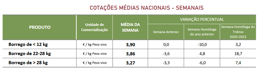 Na semana em análise as cotações médias nacionais dos borregos de 22-28 kg (-14 cêntimos / kg) e de >28 kg (-11 cêntimos / kg) sofreram um decréscimo em relação à semana anterior. Os borregos de <12 kg continuaram estáveis pela 3ª semana consecutiva, após a quebra significativa a seguir às festividades de Natal e Ano Novo. As cotações dos borregos sofreram uma redução em todas as áreas de mercado do Alentejo (-10 a -90 cêntimos / kg); as maiores quebras registaram-se nos borregos de 13-21 kg.